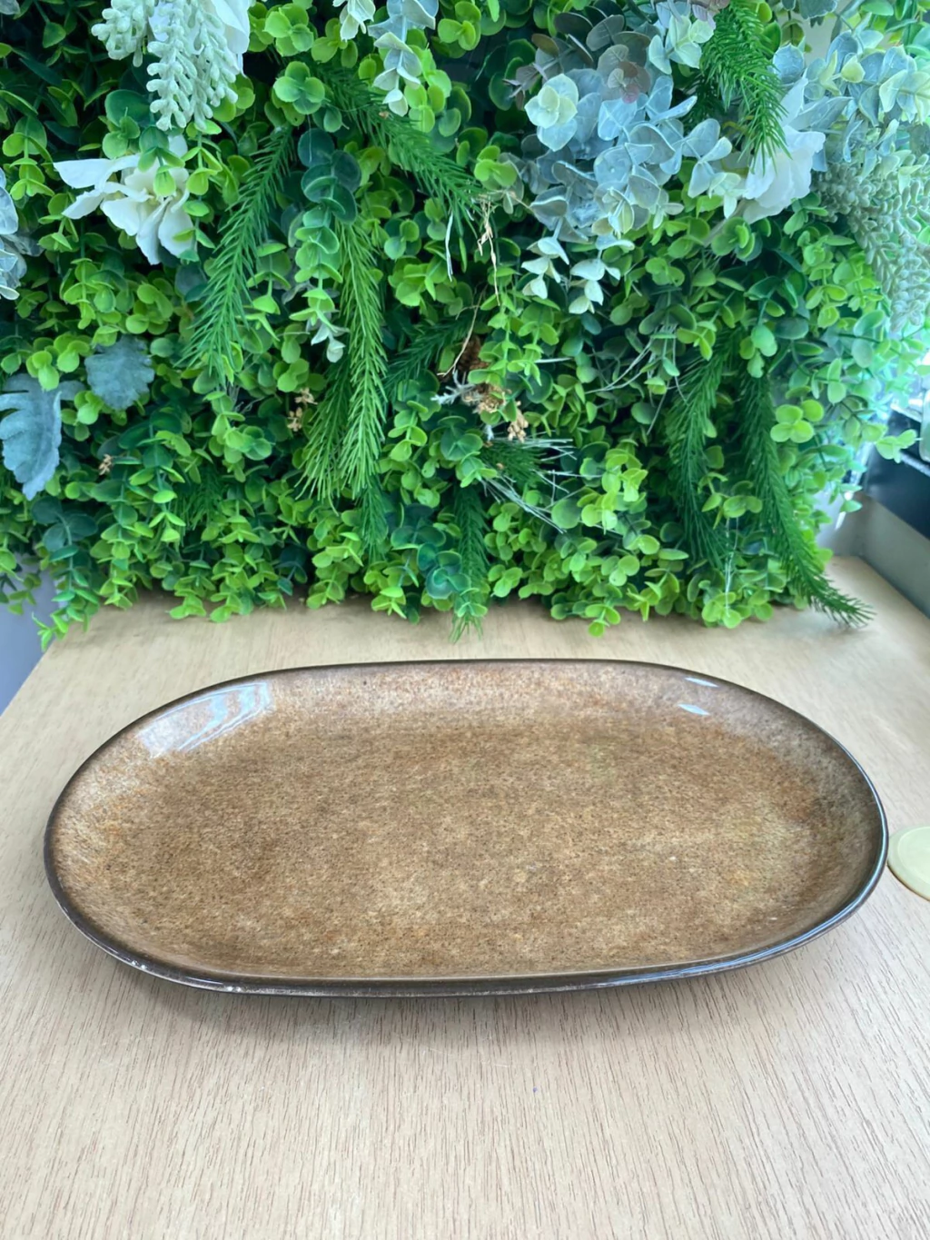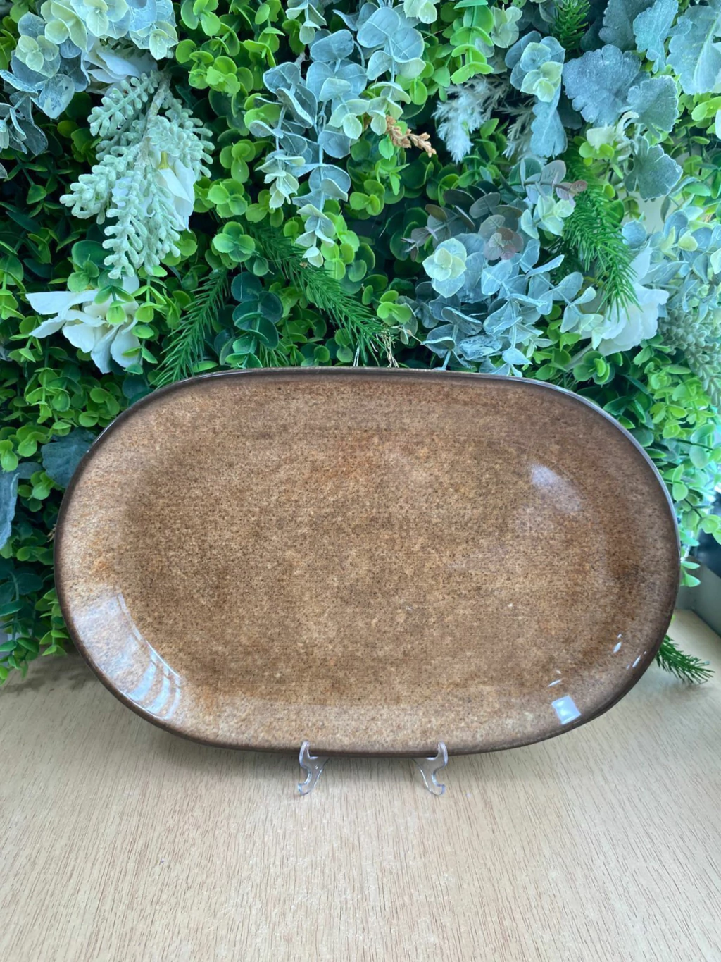 Esta é uma travessa de tamanho médio da linha Viena, com um formato oval e um design que evoca a beleza rústica e natural. A peça apresenta um acabamento que imita a textura da terra ou da areia, em tons de marrom e bege. A superfície interna é brilhante e a borda é ligeiramente mais escura, o que cria um contraste sutil, ideal para servir pratos principais, acompanhamentos ou porções.