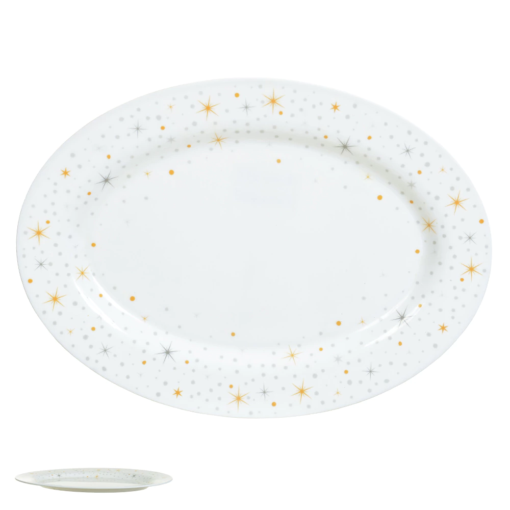 Estampa Cintilante: A borda da travessa é adornada por uma estampa delicada e festiva de estrelas e pontilhados. As estrelas maiores brilham em um tom dourado/champanhe quente, enquanto as menores e os pontos em cinza e grafite criam um efeito sutil de constelação ou fogos de artifício.