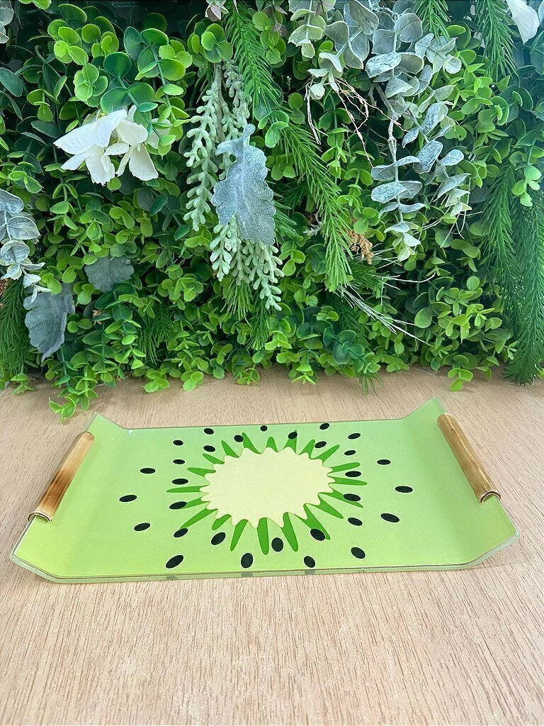 A Travessa Retangular Kiwi Tropical c/Alça Bambu 28cm é uma peça que une funcionalidade, design e um toque divertido para a sua mesa. Com 28cm de comprimento, ela é perfeita para servir uma variedade de pratos, desde petiscos e entradas a sobremesas e frutas, adicionando um charme tropical à sua apresentação.
