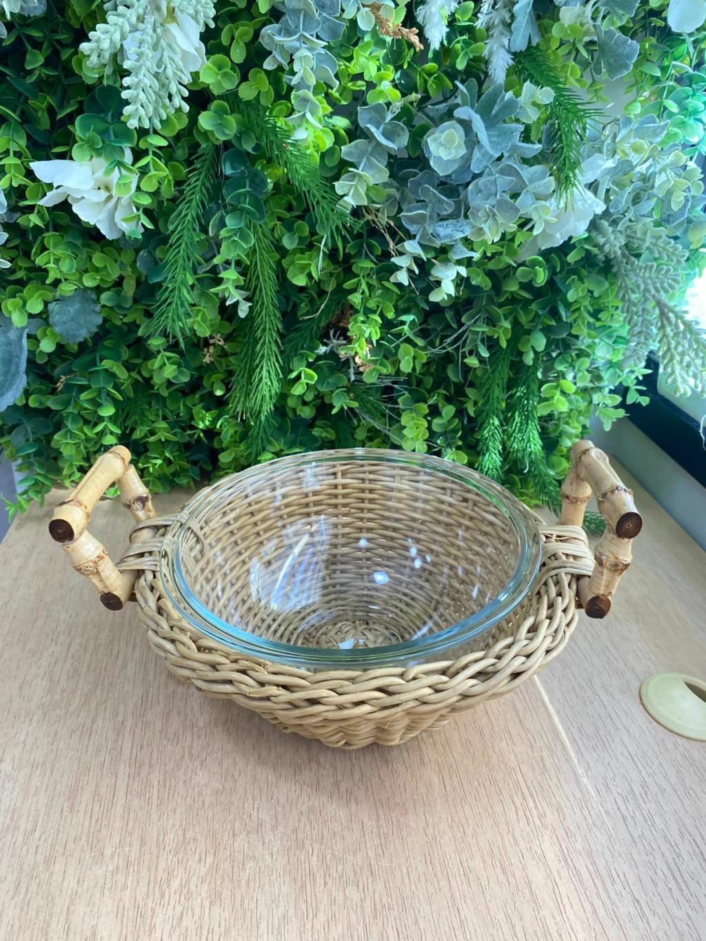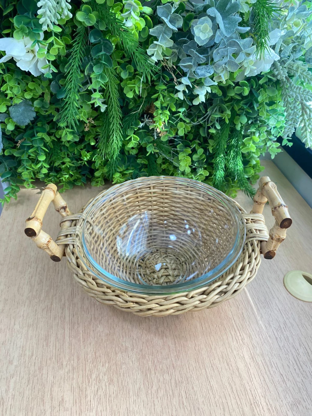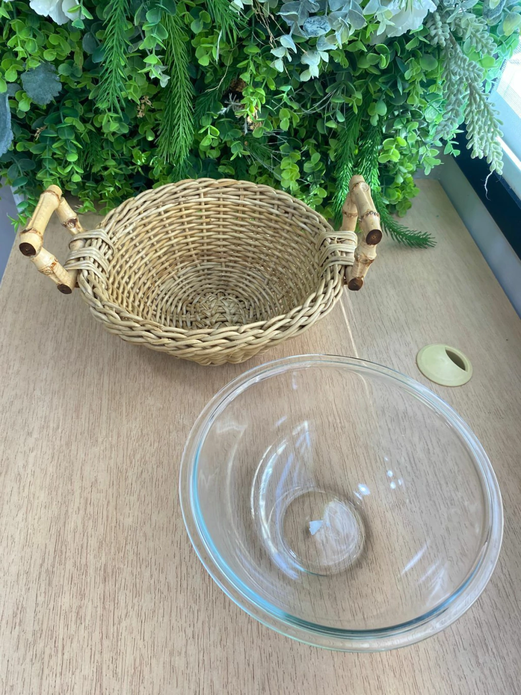 No interior do suporte, há um pirex redondo de vidro, ideal para ser usado como saladeira, fruteira ou até mesmo para servir petiscos. A combinação do junco e do bambu com o vidro cria um contraste interessante entre o rústico e o contemporâneo, tornando a peça versátil para diversas ocasiões, desde refeições casuais até eventos mais formais. A peça tem cerca de 20cm de diâmetro, o que a torna um tamanho prático para a mesa.