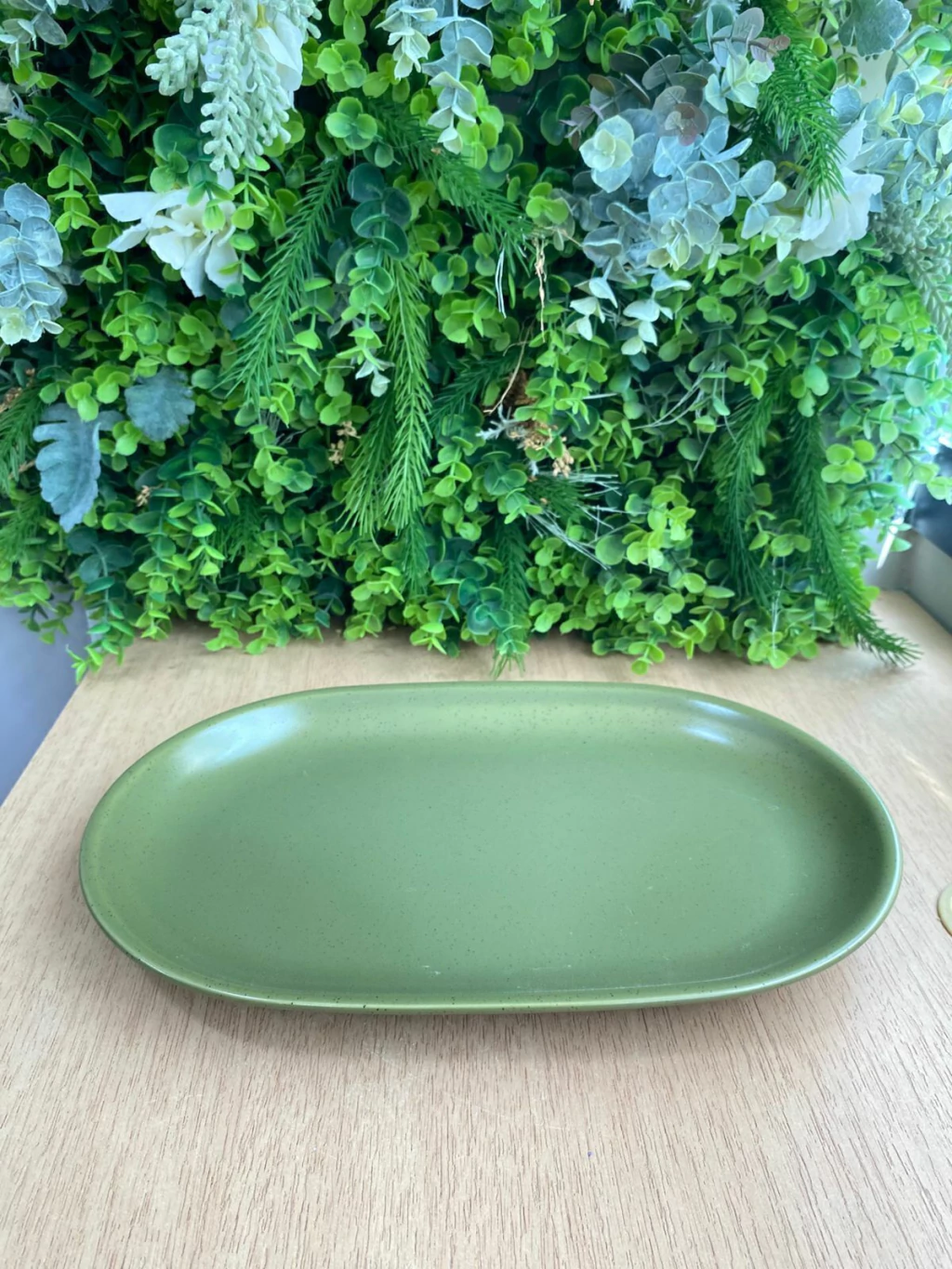 Travessa oval de tamanho médio, na cor verde-oliva, com acabamento texturizado e fosco, exibindo pequenas pontuações que dão um toque rústico à peça, Ideal para servir petiscos, acompanhamentos ou pratos principais em mesas postas com inspiração natural ou minimalista.