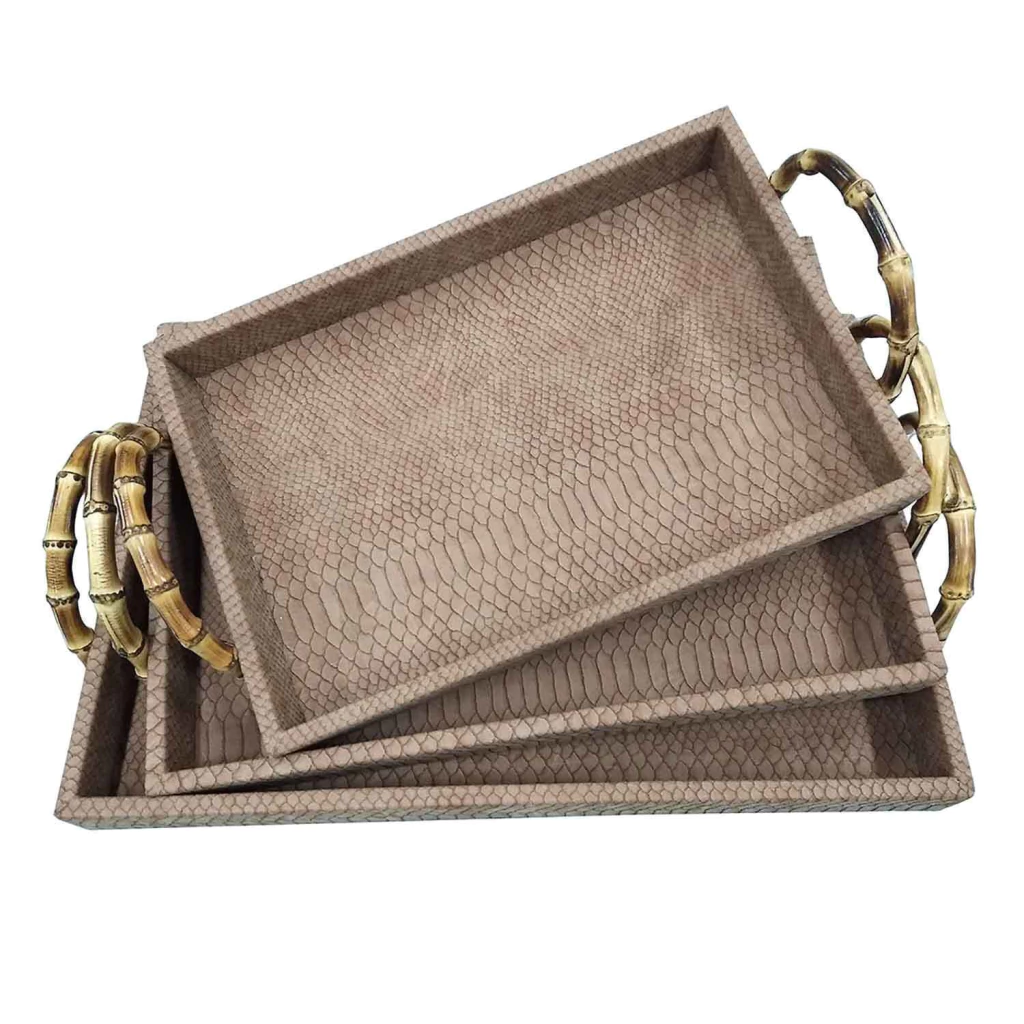 As bandejas apresentam um revestimento que simula a textura de escamas de réptil, em um tom neutro e elegante de bege, nude ou terracota claro.