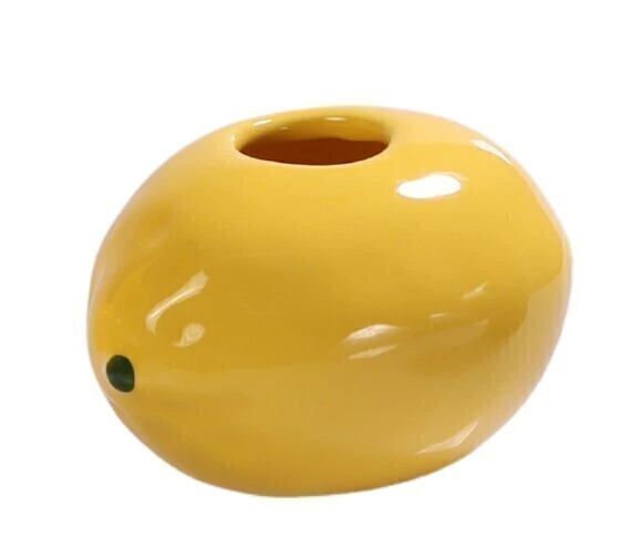 Design Cítrico e Divertido: O vaso é moldado no formato arredondado de um limão e revestido em um esmalte amarelo intenso e brilhante.