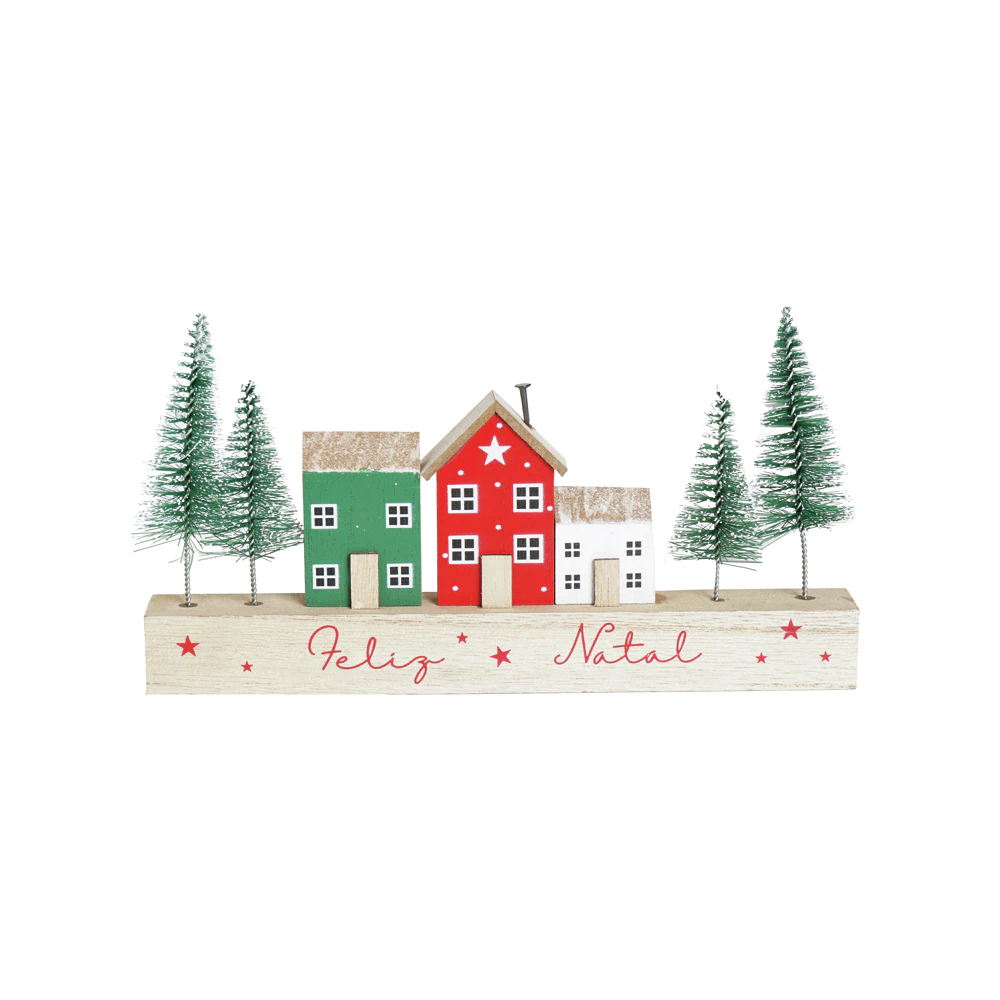 Casinhas Coloridas: As casas são blocos de madeira estilizados e pintados com as cores clássicas de Natal: uma em Verde Esmeralda, a central em Vermelho Vivo (com detalhes de flocos de neve brancos no telhado) e uma em Branco Gelo. As janelas e portas são pintadas em branco e vermelho, adicionando um toque de detalhe artesanal e lúdico.