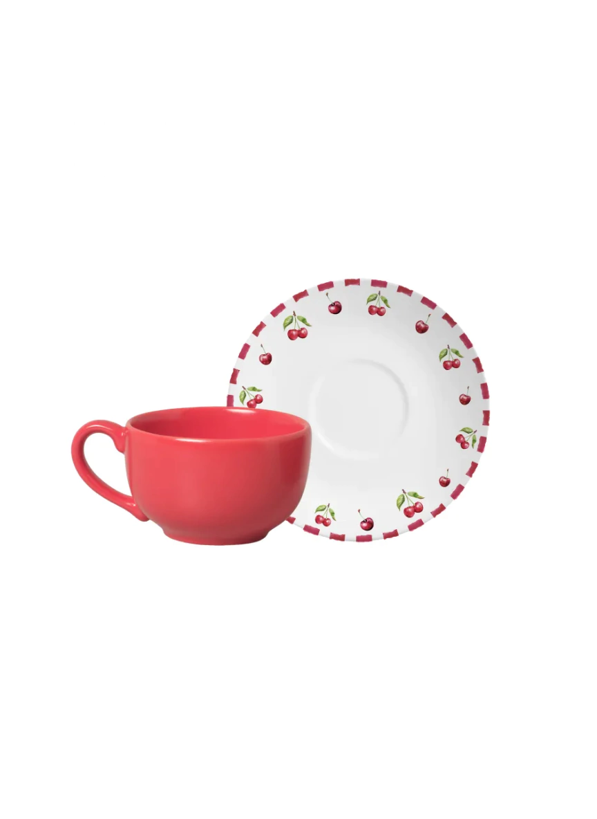 A xícara em um vibrante tom de vermelho, com seu design clássico, combina perfeitamente com o pires, em uma estampa de cerejas. É um conjunto charmoso e alegre, ideal para servir um chá ou café com estilo e adicionar um toque de cor à sua rotina.