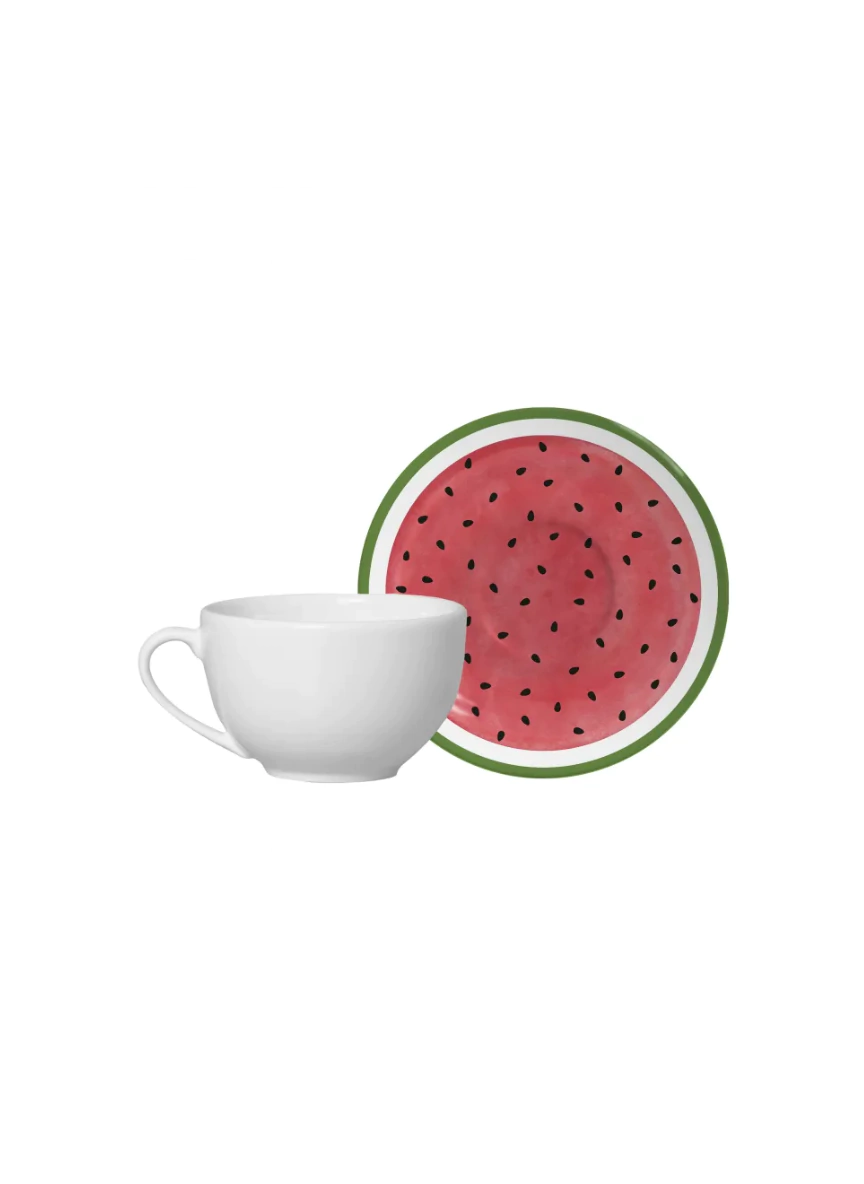 Feito com material de alta qualidade, o conjunto é ideal para um café da manhã descontraído ou um lanche da tarde mais animado. O pires com a estampa de melancia adiciona um charme único e moderno à sua cozinha, fazendo deste item uma escolha excelente para quem busca funcionalidade e estilo.