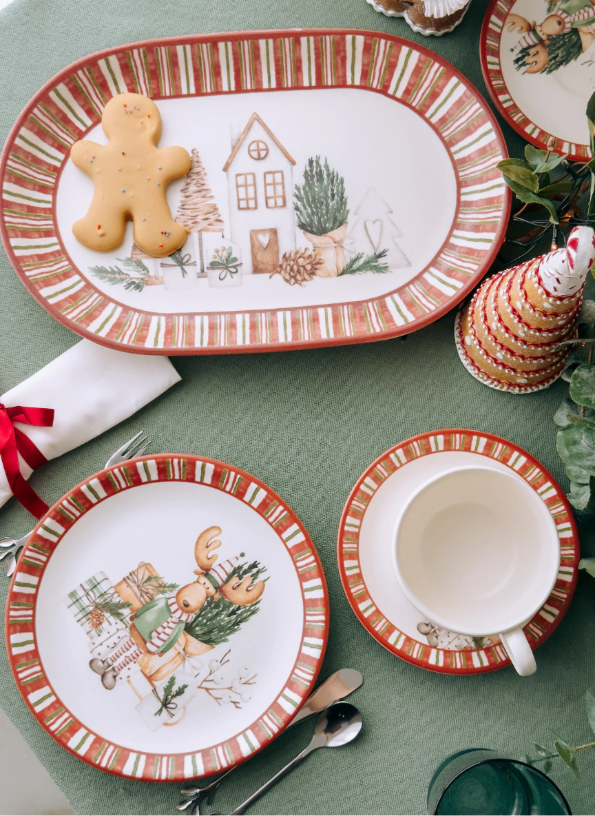 A xícara é branca, em contraste com o pires, que tem uma estampa lúdica com um charmoso alce de chapéu e cachecol em meio a presentes de Natal. A borda do pires é decorada com listras verdes e vermelhas, dando um toque especial de cor. É um item funcional e decorativo, ideal para presentear ou para tornar suas celebrações mais memoráveis.