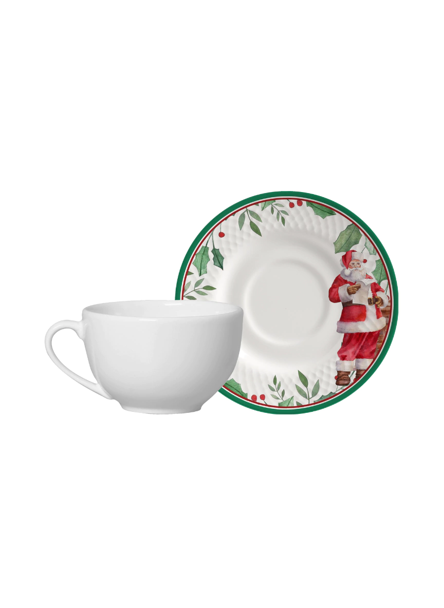 A xícara é branca, enquanto o pires tem uma estampa detalhada de Papai Noel com a sua lista de presentes. A borda do pires é decorada com folhas e bolinhas que lembram azeitonas. O fundo texturizado do pires dá um toque especial e elegante à peça.