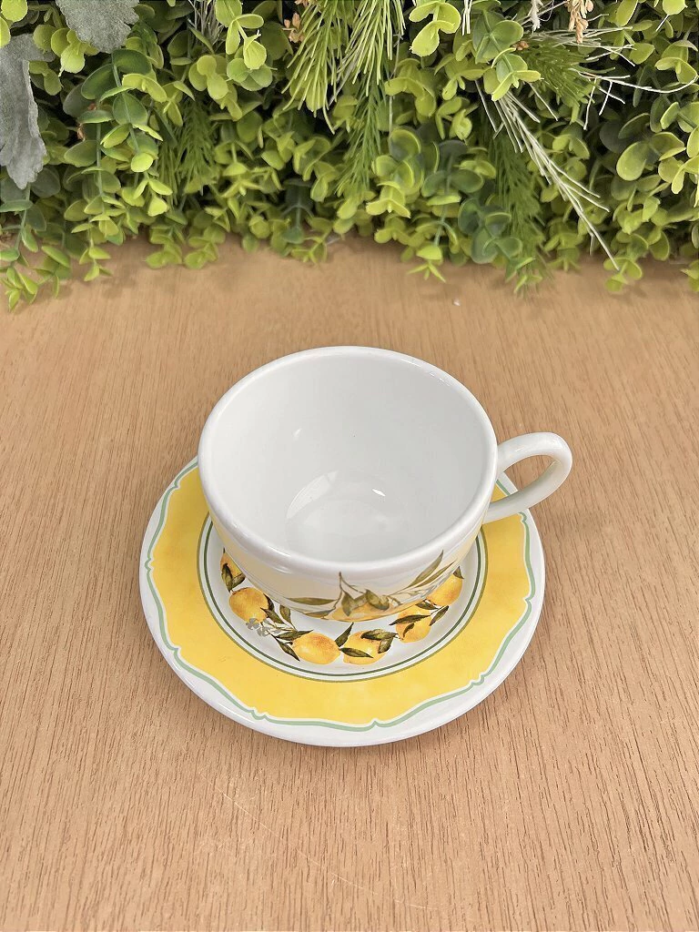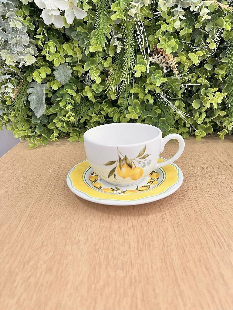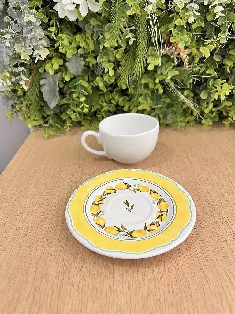 Desfrute de momentos relaxantes com a Xícara de Chá com Pires Limoeira, perfeita para apreciar sua bebida favorita. Com capacidade para 300ml, ela é ideal para um chá reconfortante ou um café especial.