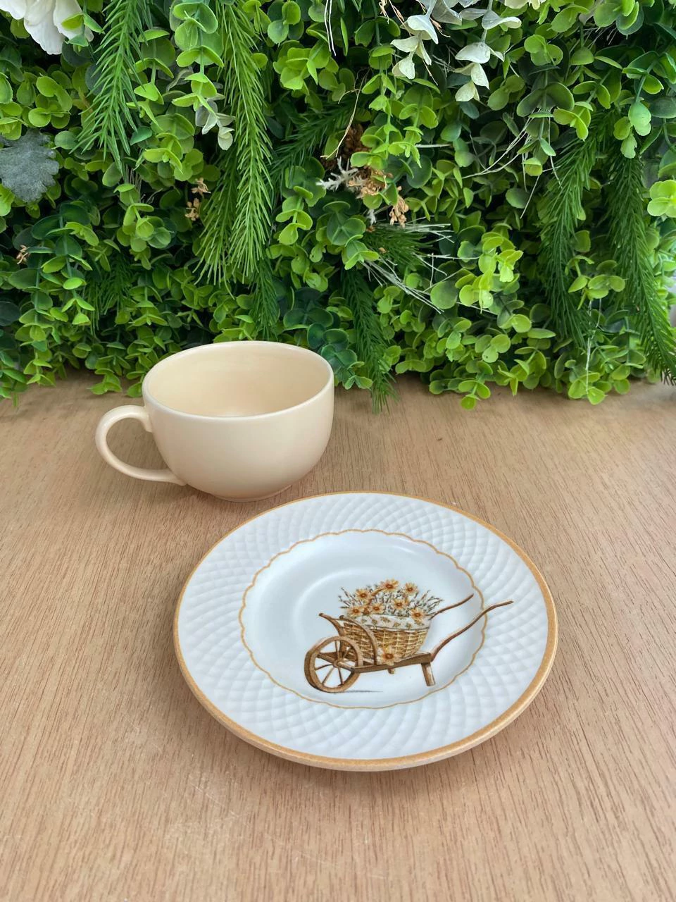 Este é um conjunto de xícara de Chá com pires da linha Rústica Campestre, com um design delicado e inspirador. A xícara é de cerâmica em um tom neutro de bege ou creme, com um formato simples e elegante, enquanto o pires, que é o destaque do conjunto, é feito de cerâmica branca com a borda texturizada em um padrão de losangos em relevo e um acabamento em um tom bege ou caramelo. O centro do pires é adornado com a estampa de um charmoso carrinho de mão de madeira cheio de pequenas flores amarelas, conferindo um ar campestre e acolhedor.